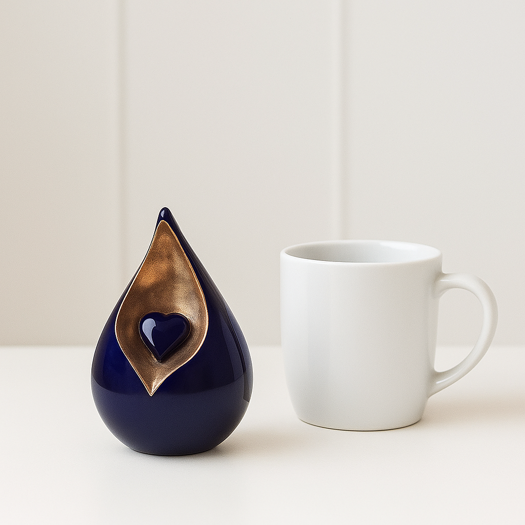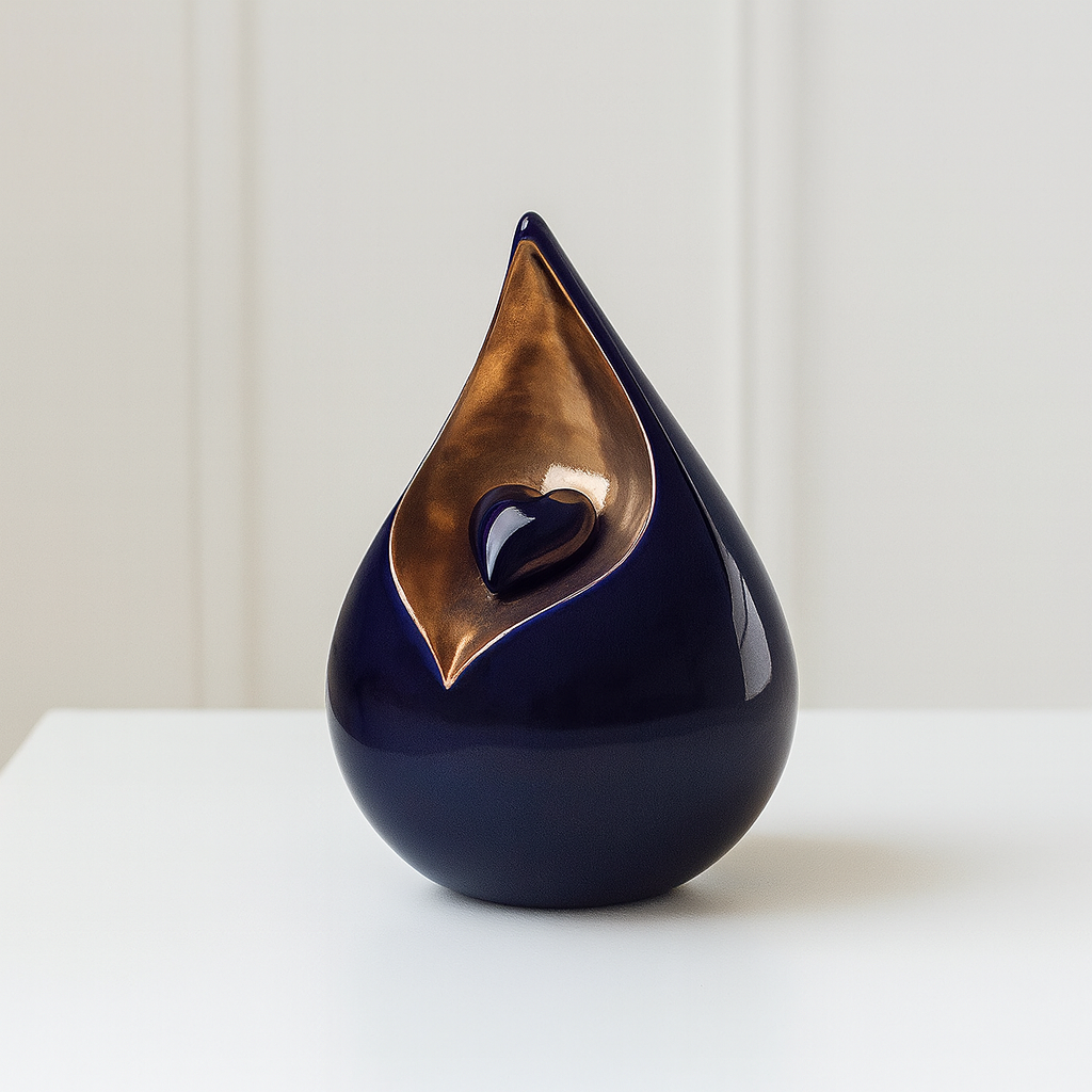 FPU 105 Metallurne Tropfen Die Celest-Urne berührt das Herz unmittelbar. Die sanfte Tropfenform, mit dem darin liegenden glänzenden Keramikherz, strahlt eine stille Wärme aus, die in Zeiten des Verlustes Trost spenden kann. Als würde die Form selbst eine Umarmung schenken, bewahrt diese Urne die Liebe, die bleibt – leise, aber kraftvoll präsent.