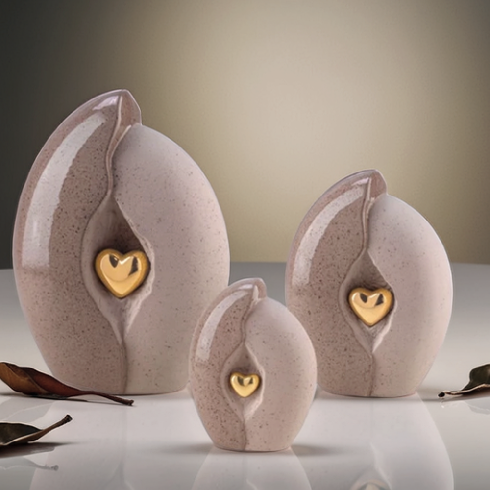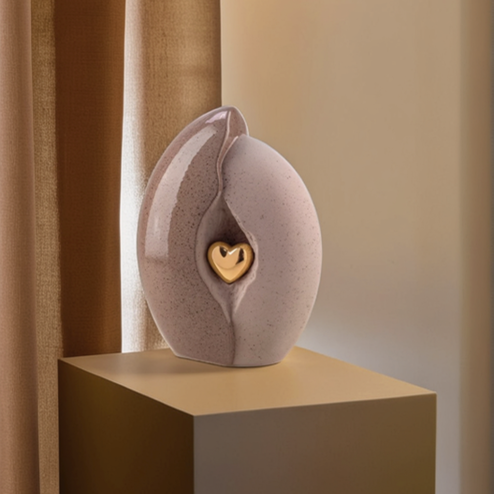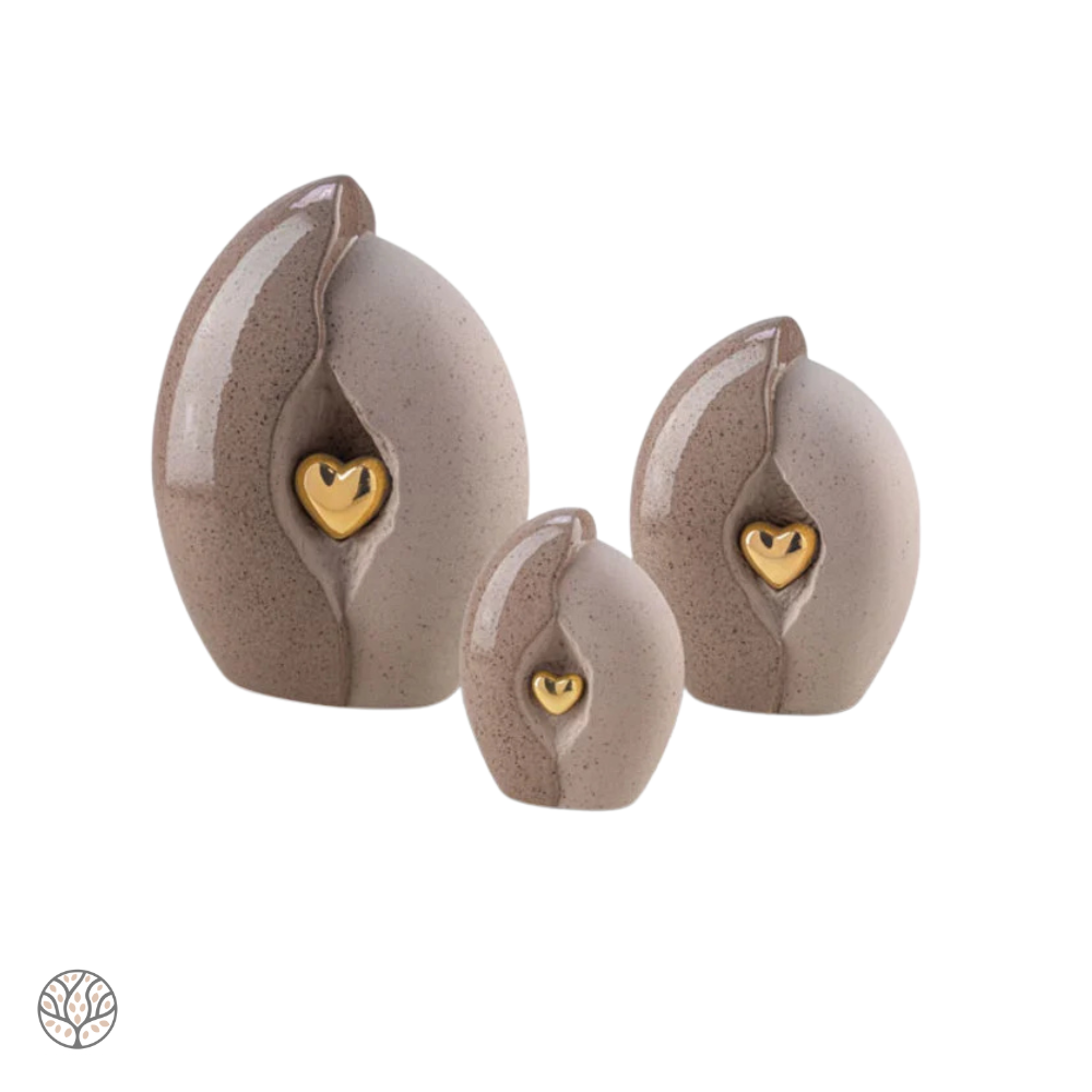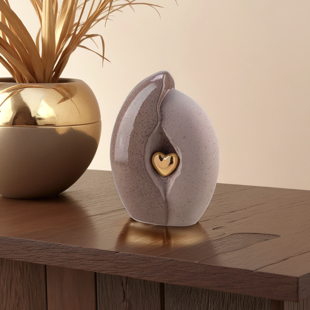 Das Design besticht durch eine einzigartige Balance zwischen glatter und leicht rauer Textur in einem sanften Beigeton. Die Asche kann sicher durch die Öffnung am Boden eingebracht werden. In der Mitte der Urne befindet sich ein kleines, symbolisches Herz – ein Symbol für Liebe und Verbundenheit.