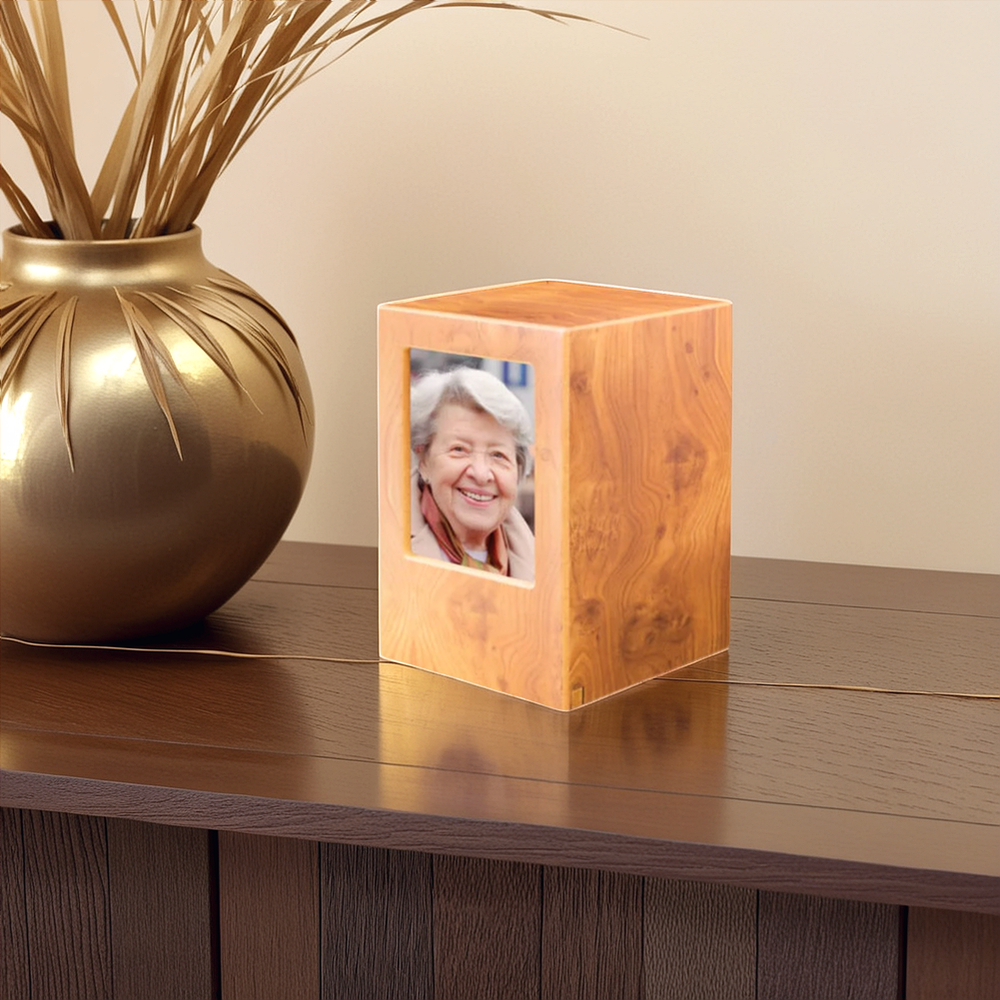 Der Verlust eines geliebten Menschen ist ein tiefgreifendes Erlebnis, und eine schöne Erinnerung kann Trost spenden. Diese handgefertigte Holzurne besticht durch ihr schlichtes und modernes Design mit dezenten Details, die ihr einen edlen Look verleihen. Das Besondere an dieser Urne ist die Möglichkeit, ein Foto Ihres geliebten Menschen eingravieren zu lassen – ein persönliches und einzigartiges Andenken. Die Urne lässt sich leicht von unten befüllen.