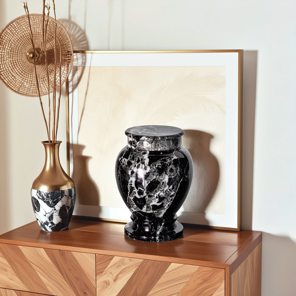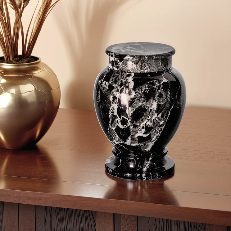 Der hochwertige Marmor für diese Urnen stammt aus asiatischen Steinbrüchen. Große Natursteinblöcke werden aus diesen Steinbrüchen geschnitten und anschließend mit speziellen Formen zu Urnen geformt. Da jeder Natursteinblock seine eigenen, einzigartigen Farbtöne, Kristallstrukturen und Adern aufweist, gleicht keine Urne der Kollektion der anderen. Dies macht die Marmorurnen zu einem vollkommen natürlichen Produkt mit einzigartigem Charakter.